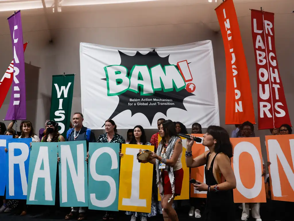 A Rede de Ação Climática (CAN) faz ato em protesto por uma transição climática justa, na Conferência das Nações Unidas sobre Mudanças Climáticas (COP 30) em Belém.