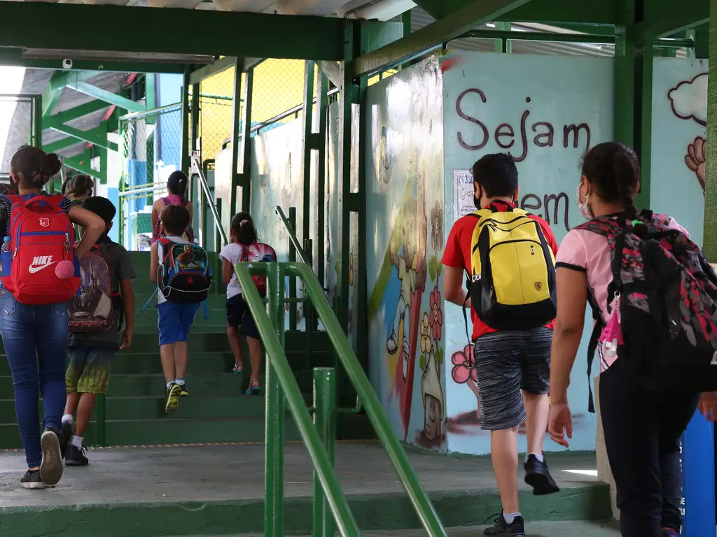Crianças do ensino fundamental chegam para as aulas presenciais na Escola Estadual Terezine Arantes Ferraz Bibliotecaria, em São Paulo (SP)