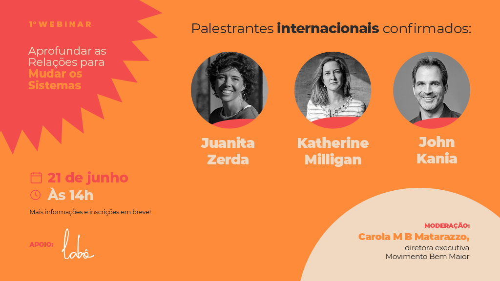 Juanita Zerda, Katherine Milligan e John Kania, do Collective Change Lab (CCL), são especialistas renomados em inovação e transformação social e autores de “Aprofundar as relações para mudar os sistemas”, que a SSIR Brasil publica na sua quarta edição. Ao longo de 90 minutos, eles irão falar sobre as motivações para escrever o artigo (que foi o mais lido em ssir.org em 2022) e sobre 5 abordagens a partir das relações para mudanças transformadoras: Engajar em um trabalho relacional profundo, Atender à mudança interna e externa, Cultivar um espaço para a cura e Transformar as dinâmicas de poder.