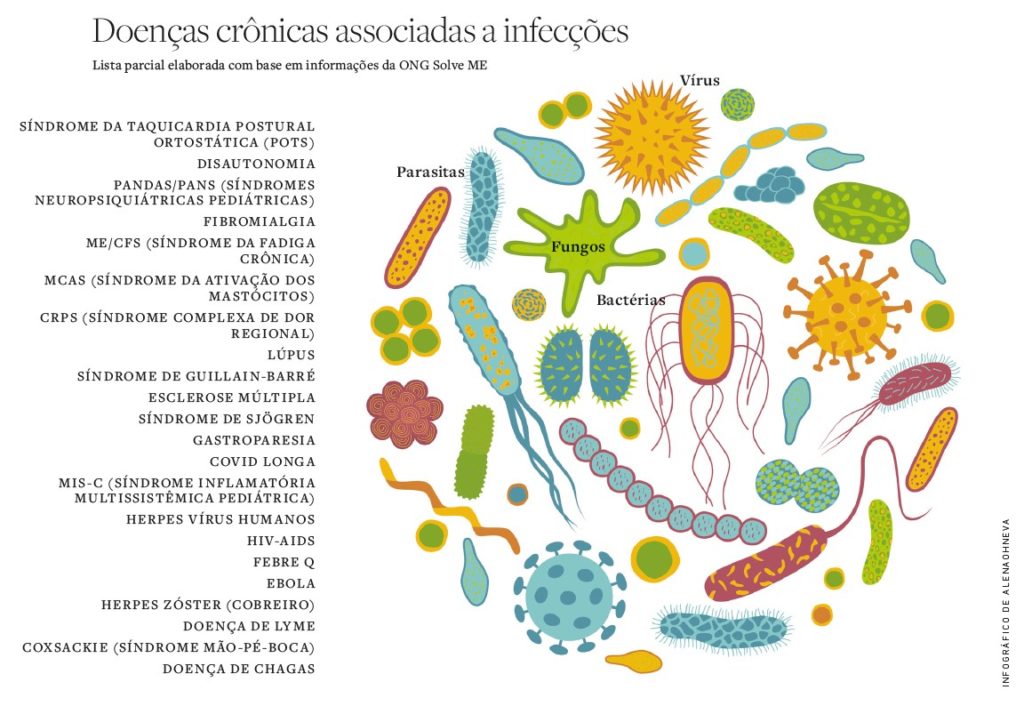 Compreender as características biológicas que essas condições compartilham pode trazer insights importantes para resolvê-las. Um número crescente de estudos demonstra um elo entre doenças crônicas e infecções. A patogênese da doença de Lyme, por exemplo, foi estabelecida como bacteriana, e a da covid longa, como uma infecção viral. Da mesma forma, os sintomas da fibromialgia podem começar após uma variedade de infecções, e os cientistas acreditam que o vírus Epstein-Barr causa alguns casos de ME/CFS, lúpus, esclerose múltipla e muitas outras doenças autoimunes.