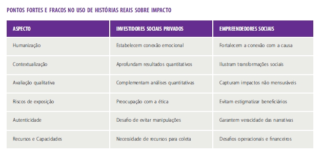 Análises de relatórios empresariais e entrevistas realizadas com investidores e empreendedores sociais mostram que investidores e doadores valorizam as histórias de impacto real como meio de compreender melhor as transformações sociais e ambientais promovidas.