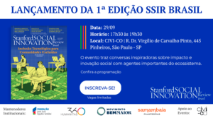 O evento de lançamento da primeira edição da Stanford Social Innovation Review Brasil traz conversas inspiradoras sobre impacto e inovação social com agentes importantes do ecossistema. Formato: Presencial - CIVI-CO | R. Dr. Virgílio de Carvalho Pinto, 445, Pinheiros, São Paulo Data/horário: 29/09 às 17h30 Inscreva-se 17h15 | Recepção e distribuição da revista impressa 17h30 | Abertura Apresentação SSIR