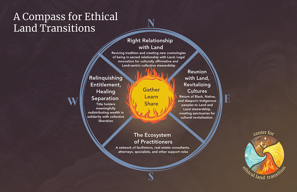 Utilizando o referencial “A Compass for Ethical Land Transitions” [Uma bússola para transições fundiárias éticas, em tradução livre], criado pelo CELT, Ferrera introduziu um vocabulário comum que priorizava a relação em vez da transação e a cura em vez da pressa.