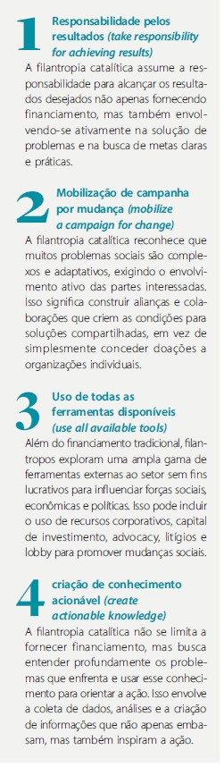 A filantropia catalítica – capital catalítico de origem filantrópica – destaca a potencialidade desse mecanismo em gerar impactos significativos a partir de inovações que, muitas vezes,não encontram espaço nos setores empresarial e governamental. Como destaca Kramer, esse tipo de capital apresenta características específicas que o diferenciam do capital deoutras origens: